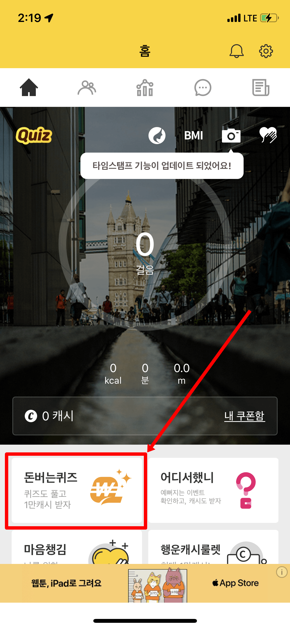 빨간 박스의 "돈버는 퀴즈"를 눌러 주세요.