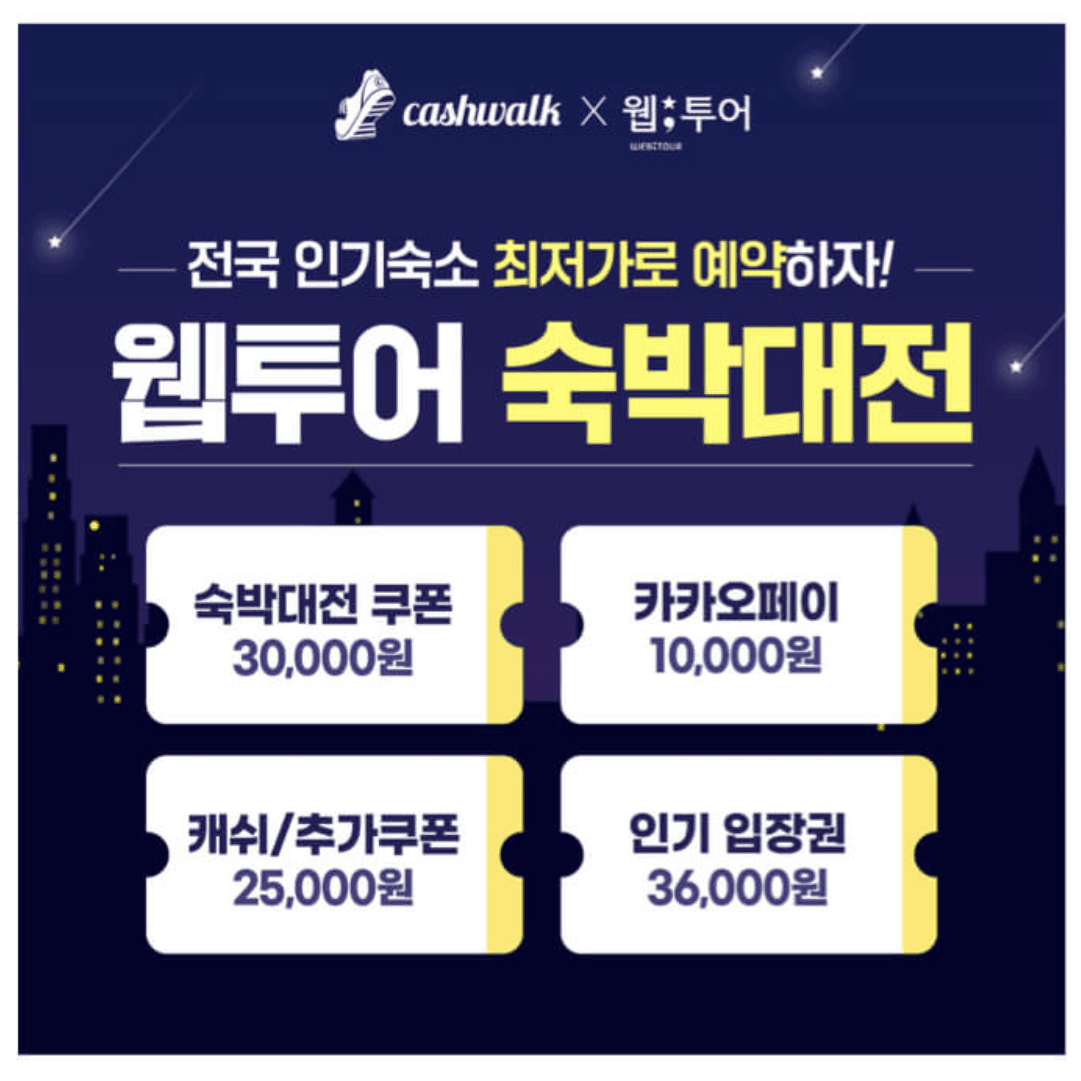 현재 웹투어에서 연말 최대 숙박행사인 "대한민국 숙박대전"에 참여하여 캐시워크 돈버는 퀴즈를 출제하면서 이벤트를 하고있습니다.