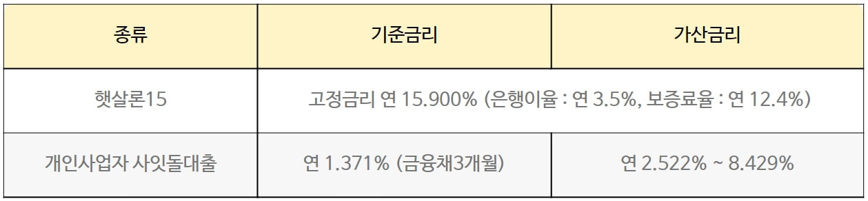 | 햇살론15 | 사업기간 3개월 이상, 연소득 4500만원 이하 |