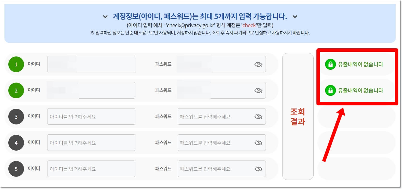 인증이 완료되면 아이디와 비밀번호를 최대 5개까지 입력해 조회 할 수 있습니다. 입력한 정보는 조회 후 즉시 파기되기 때문에 안심해도 됩니다.