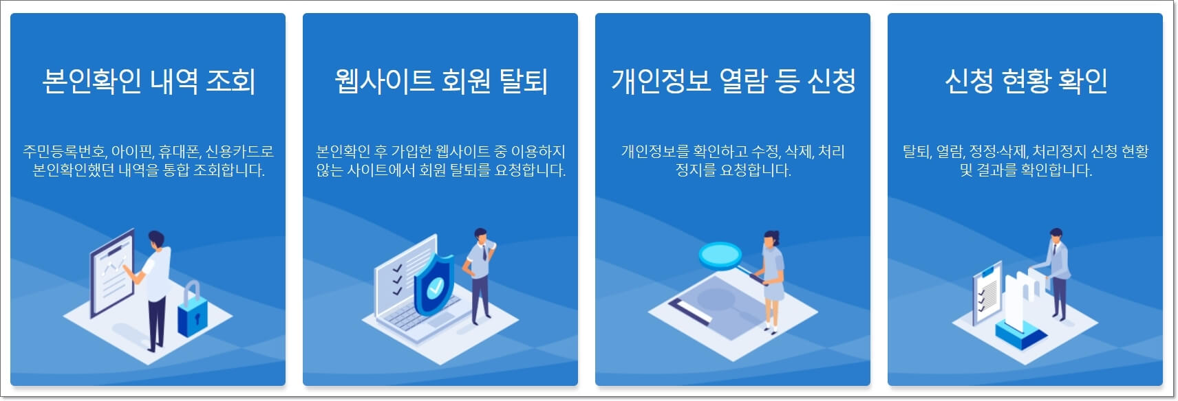이를 위해 정부에서는 '털린 내 정보 찾기 서비스' 를 제공하여 내정보가 유출 되었는지 확인할 수 있고, 불필요한 회원가입 탈퇴 등 개인정보를 안전하게 관리할 수 있게 되었습니다.