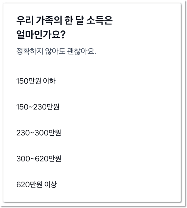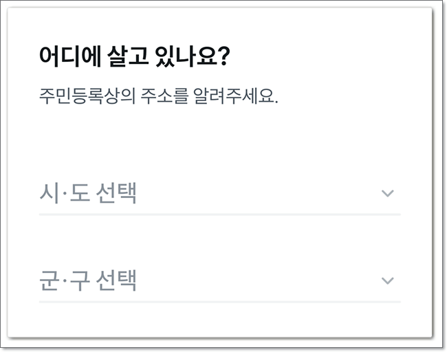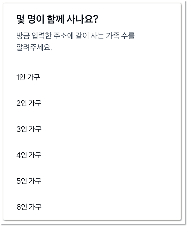 주민등록상의 주소를 선택하여 주고, 함께 사는 가족의 수 및 대략적인 가족의 소득을 선택하여 줍니다. 여러 선택마다 지급되는 지원금이 달라지기 때문에 파악하고 있습니다.