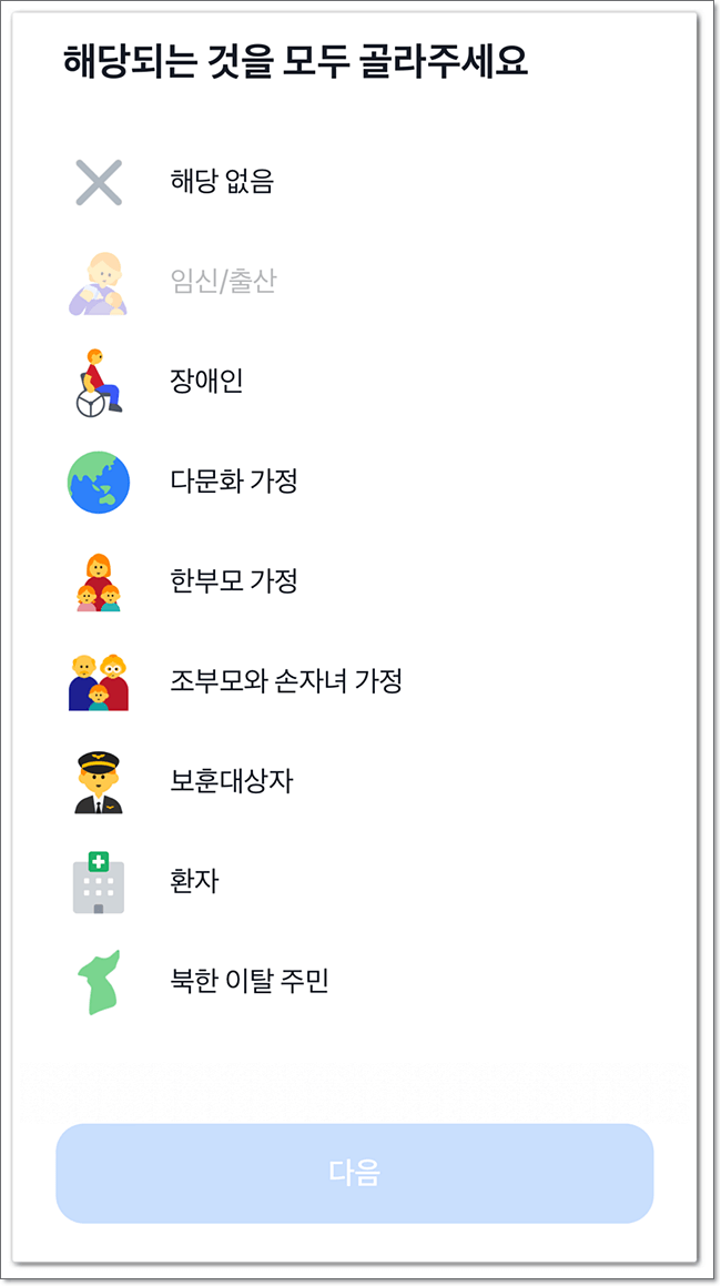 다문화 가정, 한부모 가정 등 자신에게 해당되는 것을 모두 선택하여 눌러줍니다.