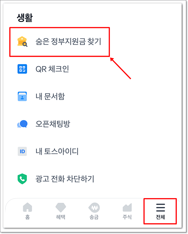 위 링크를 통하여 어플을 실행한 후, 우측 하단의 “전체” 메뉴를 선택하고 아래로 내려보면 "숨은 정부지원금 찾기"를 클릭합니다.