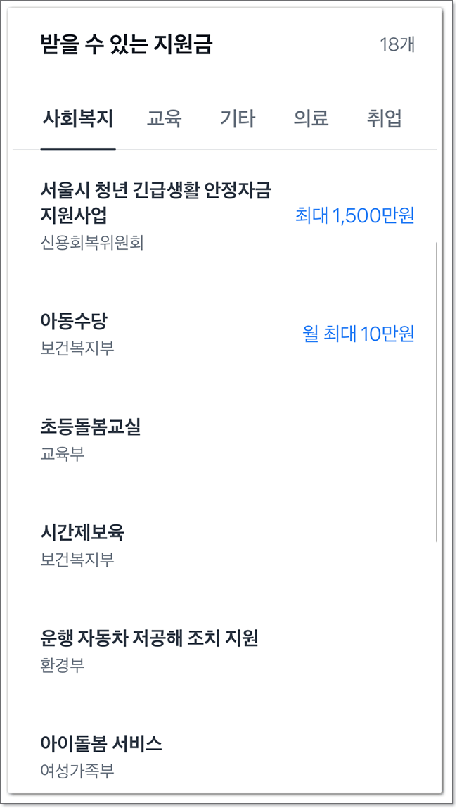 이를 통해서 긴급복지 생계 지원, 근로장려금이나 자녀 장려금 등 사회복지부터 교육, 의료, 취업 등 많은 복지서비스 및 정부지원금을 찾을 수 있습니다.