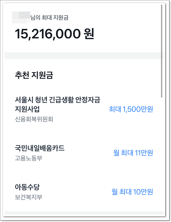 어렵지 않죠? 다 선택하셨다면 아래 이미지와 같이 자신이 받을 수 있는 최대 지원금이 나오게 됩니다.
